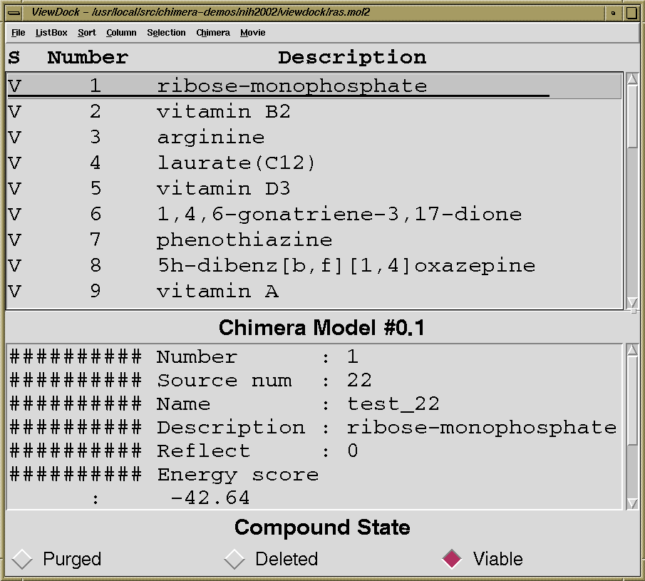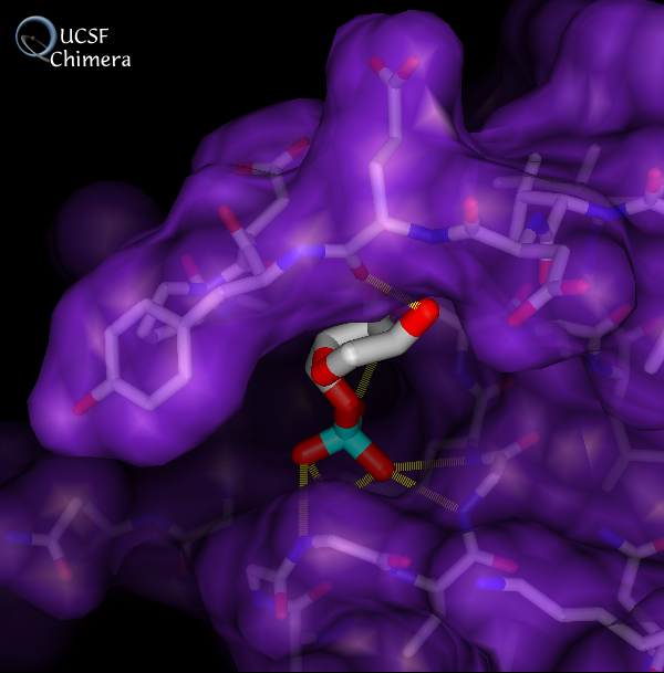 The program DOCK (Kuntz group, UCSF) is typically used to search a database for compounds that may bind to a target protein structure. The Chimera tool ViewDock facilitates interactive screening of hits output from DOCK. The ViewDock interface (above, right) lists the docked molecules, and clicking on a line displays that molecule in the graphics window and shows information such as scores in the lower panel. The target structure in this example is H-Ras (PDB entry 121p), which is often mutated in malignant tumors in humans. The docked molecule is ribose monophosphate. Carbons are gray, oxygens are red, nitrogens are blue, and phosphorus is cyan. Hydrogens are not shown. Potential hydrogen bonds are shown as dashed yellow lines between donor and acceptor.