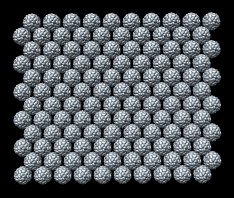 Figure 3: Virus particle surfaces from atomic coordinates. Here the crystal plane from PDB model 1a34 is shown with each virus particle being surfaced separately instead of each capsid protein surfaced separately as in figure 2. The divisions between proteins are not apparent. The particle surfaces are computed from atom density using 8 angstrom bins as explained in figure 4.