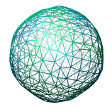 Figure 4: Virus particle surfaces at different resolutions from atomic cooordinates. Virus surfaces shown at different resolutions using crystal structure 1a34. The surfaces were calculated by placing all 240,000 atoms in a grid of bins of sizes 5, 10, 15, 20, or 30 angstroms and taking a contour surface of the atom density at 0.02 atoms per cubic angstrom. Also 2 iterations of smoothing were done moving each vertex 0.3 of the way towards the average position of neighboring vertices. This was to hide the triangles making up the surface. The top row shows the surface in a single color. The second row shows the surface radially colored (yellow at 80 angstroms radius, blue at 95 angstroms). The third row shows the surface mesh indicating the sampling. Notice that at 20 or 30 angstroms the icosahedral symmetry is not even apparent in the radially colored surface because of the coarseness of the sampling. The AFM data in figure 1 has sample spacing 15.6 angstroms.