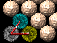 Particle size. Virus particle diameter measured from particle spacing along the close packing axis of the AFM scan is 15.47 nanometers. From PDB model 1a34 the spacing is 16.44 nanometers.