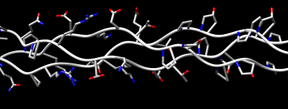 Command: repr stickMove and scale the structure as desired throughout the tutorial. The structure contains three chains. Each chain is in a left-handed polyproline II helix conformation, and together the chains form the right-handed triple helix characteristic of fibrillar collagen. The ribbons are narrow because the peptides are not in a standard alpha-helical conformation.