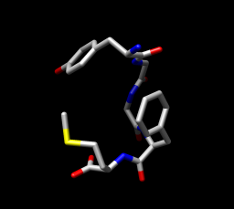 It is thought (see the reference and papers cited therein) that a conformation of enkephalin in which the Tyr and Phe rings point in different directions (like frames 1 and 25) binds to μ-opioid receptors and a conformation in which they point toward each other (like frames 2 and 80) binds to δ-opioid receptors.