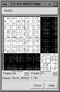 In the RMSD map, the axes are frame numbers; lighter squares reflect pairs of frames with lower RMSDs (more similar structures) and darker squares reflect pairs of frames with higher RMSDs (less similar structures). Mousing over the map shows the RMSD values and the numbers of the frames being compared. Clicking on the map enters the corresponding pair of Frame numbers below the map. Clicking Go then displays that frame in the main Chimera window.