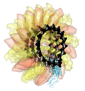 This structure shows part of the receptor found on the surface of cells in your nose that the virus recognizes. These are the chains that appear in rings of 5 near the 5-fold symmetry axes. We'll color the receptor so it stands out.