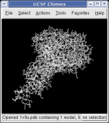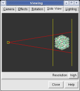 The two yellow lines in the Side View dialog are near and far clipping planes and the yellow square represents your eye position in this view from the side. Everything in front of the near clip plane or behind the far clip plane is invisible in the main Chimera window.