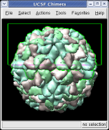 The far portion of the capsid is invisible because Chimera's near and far clip planes were positioned for the 1v9u asymmetric unit, not the full capsid. Adjust the clip planes.