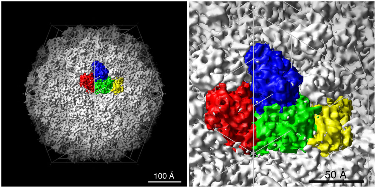 Figure caption: UCSF/Chimera image of the CIV capsid color-coded to show the 12 pentasymmetrons (blue and red) and 20 trisymmetrons (pink and green) in the icosahedral surface lattice.