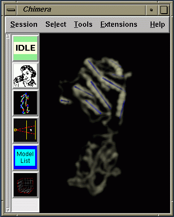 The images were produced using the Chimera molecular visualization program developed by the Computer Graphics Lab at UC San Francisco. The model and data can be interactively rotated, and scaled, and thresholds adjusted using the mouse. The images were captured on an SGI and are best viewed on a SGI or Mac. They will look dark on a PC, Sun, or DEC Alpha because those platforms don't do gamma correction.