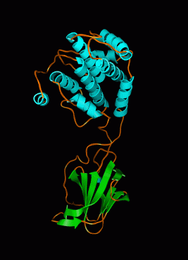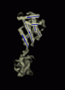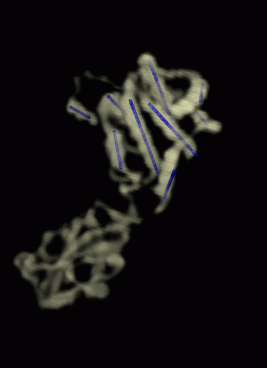 | Figure 1: Ribbon diagram of bluetongue virus VP7 monomer. Matthew Baker and Wen Jiang of the National Center for Macromolecular Imaging simulated an 8 angstrom resolution density map based on this crystal structure (chain 1 of RCSB entry 1bvp). They used the simulated data to test their programs Helixhunter and Foldhunter which find alpha helices and folds in density maps. The programs are described in a Journal of Molecular Biology article. | Figure 2: Simulated 1BVP density map and blue rods representing where helices are found by the Helixhunter program. The blue rods have 1 angstrom diameter. chosen smaller than the the diameter of an alpha helix so the density map is not hidden. The 9 helices are well resolved in the 8 angstrom simulated density map. Helixhunter finds them but does not always realize their full length as shown in figures 3 and 4. QuickTime movie (1.9 Mb) of data and helixhunter cylinders being rotated. |