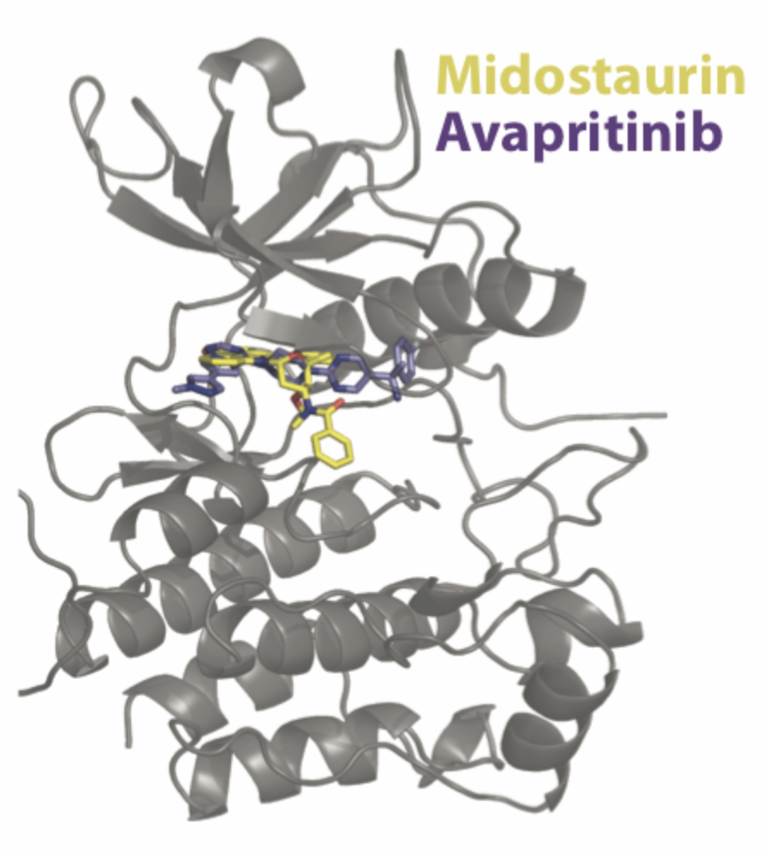 Receptor tyrosine kinase (KIT) with docked midostaurin and avapritinib drugs.