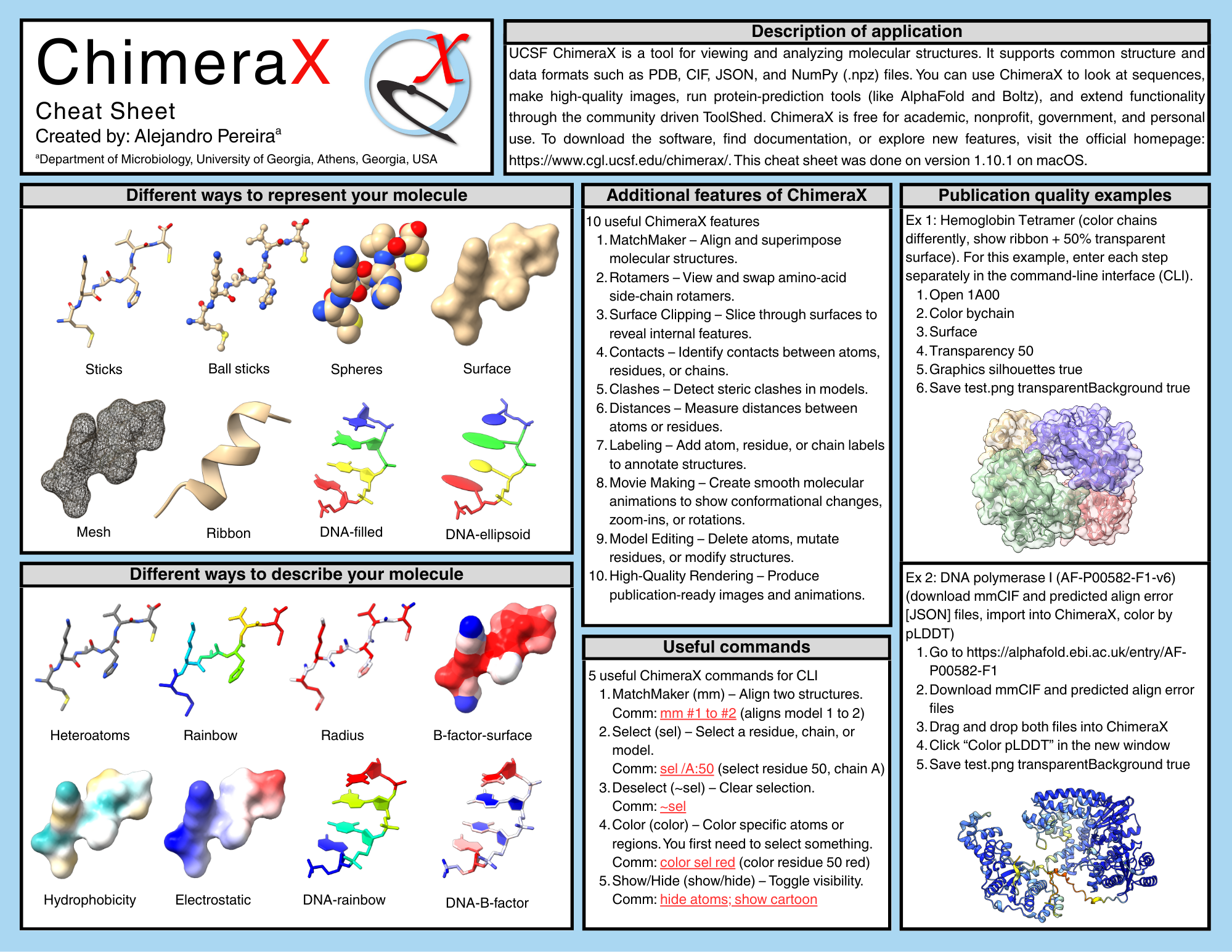 ChimeraX cheat sheet by Alejandro Pereira, February 2026.