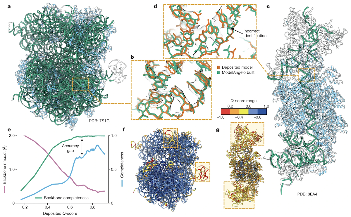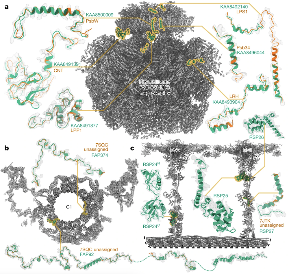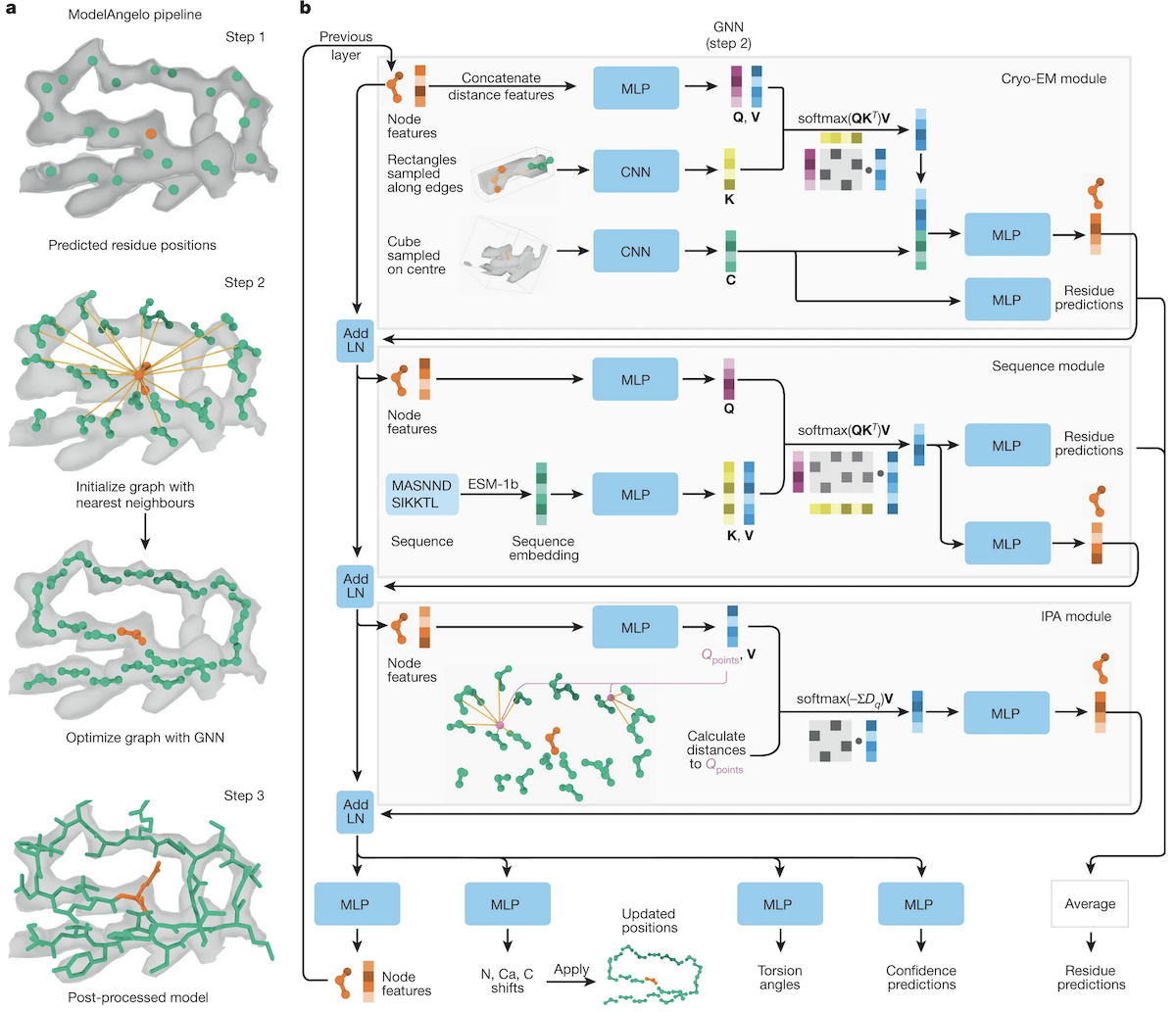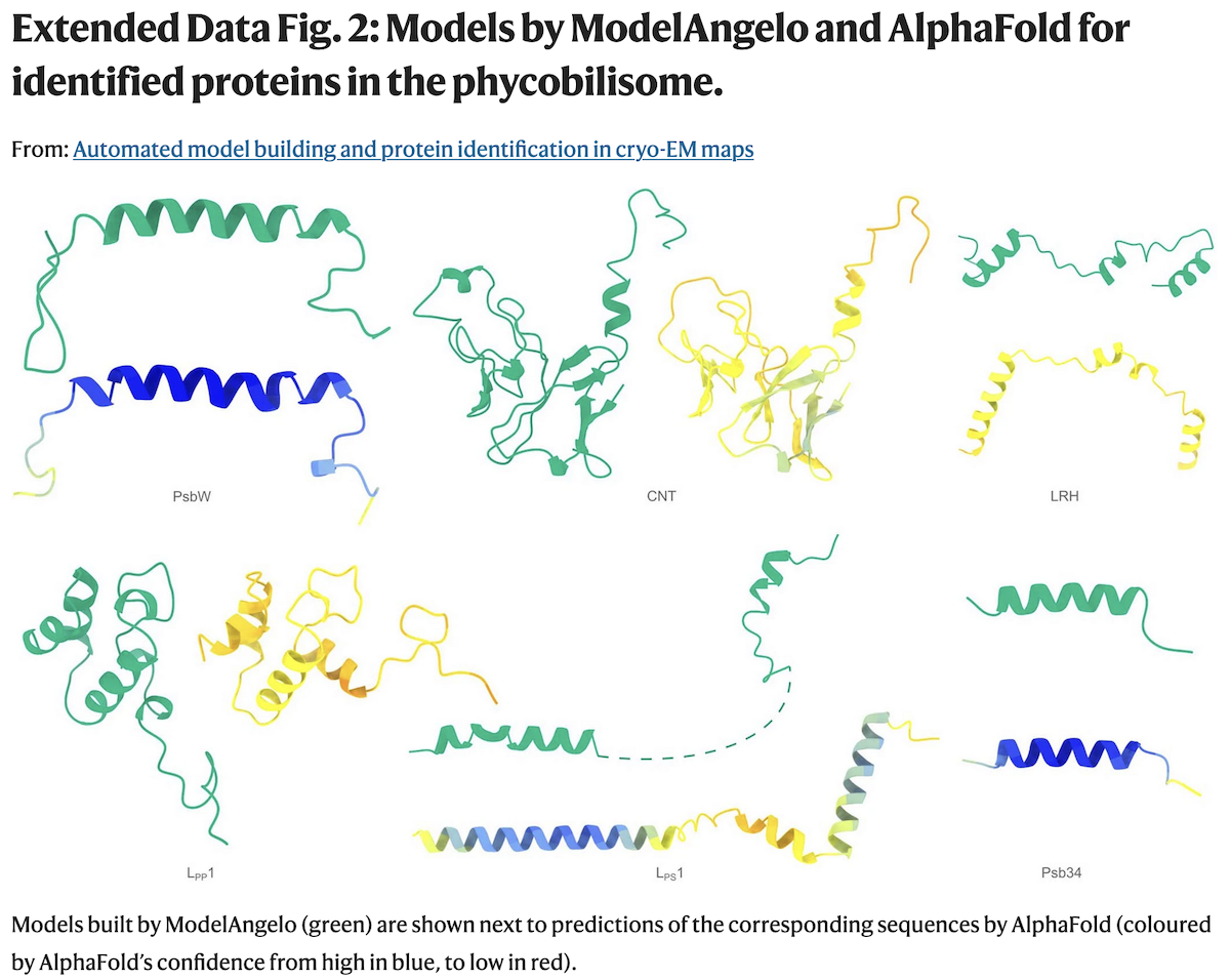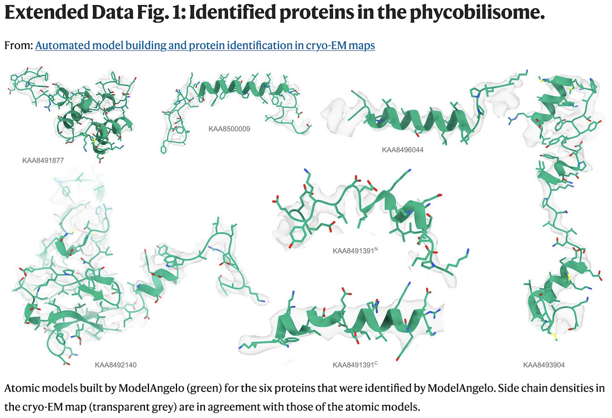 Automated model building and protein identification in cryo-EM maps. Jamali K, Käll L, Zhang R, Brown A, Kimanius D, Scheres SHW. Nature. 2024 Nature. Apr 11;628(8007):450–457.