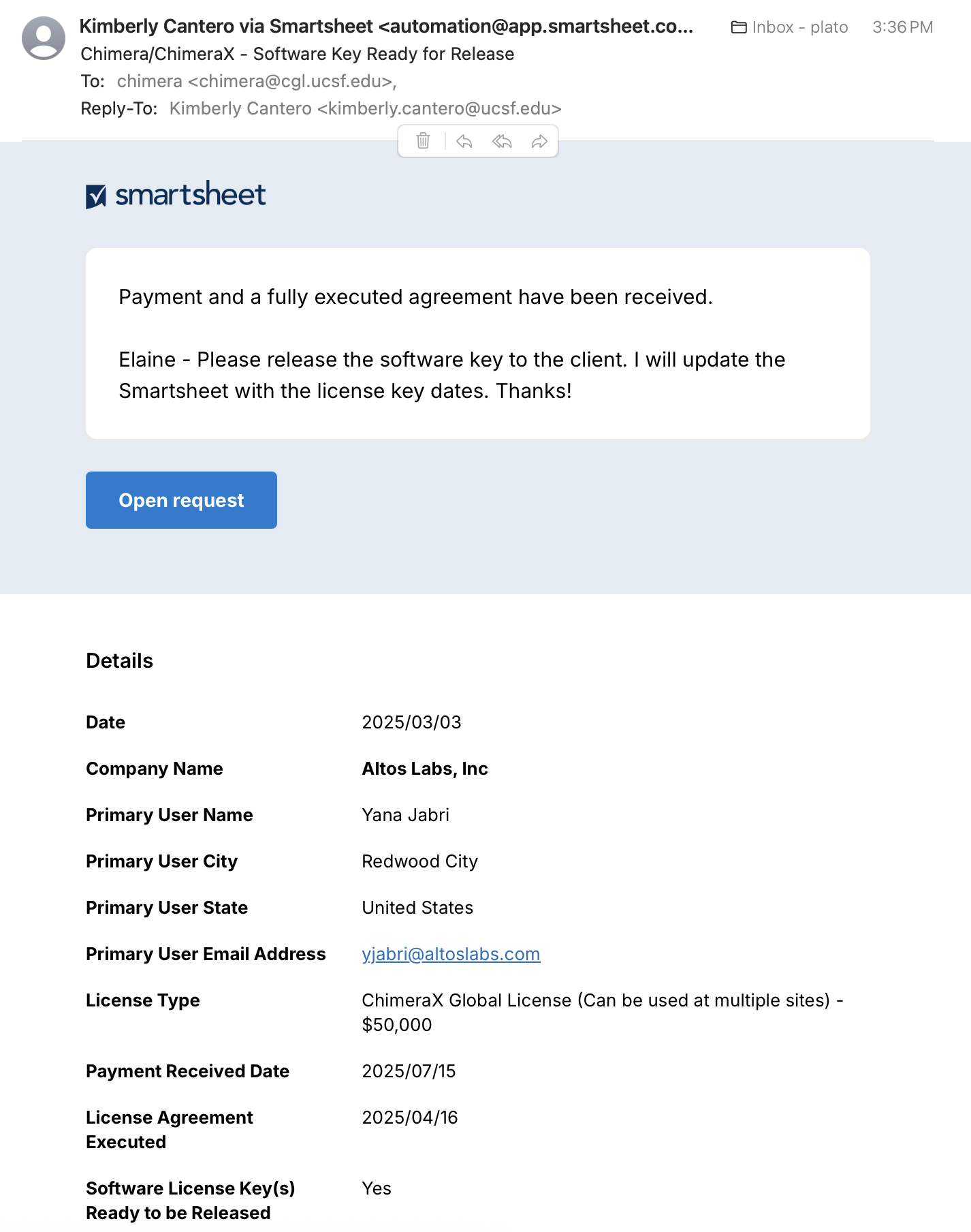 - I go to the relevant Google doc form letter * [ChimeraX] [Chimera] copy it, and paste into an email to the contact, CC myself, Tef, chimera@cgl.ucsf.edu, any others at the company that should also be CC'd according to my spreadsheet. Then I paste in the actual license key and edit number of users, or say it is global, and also attach the license key as a text file, then send it after doublechecking everything. In this case Tom L from Altos Labs had sent a message 6/27/25 requesting to be the primary user, but nobody on our end ever replied and Yana J had filled out the form with her own name, so that's what ended up in the license key. However, I CC'd Tom L on the email with the license key (sent 7/15/25).
