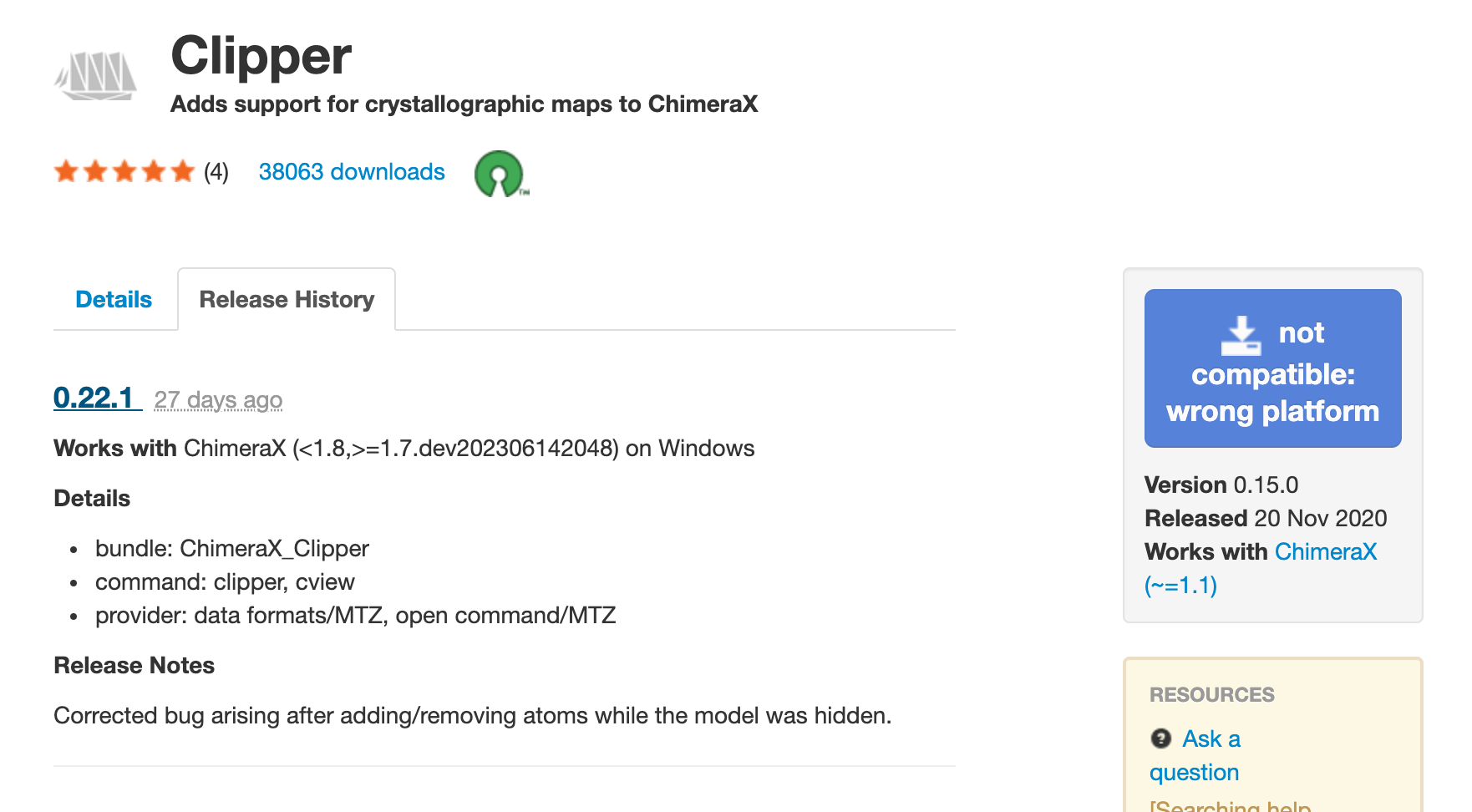 The one downside is if someone has ChimeraX 1.1 and tries to install Clipper it will say no compatible versions are available. But they really should update ChimeraX in that case so I think deleting 0.15 is better for almost all users who are not using ChimeraX 1.1.