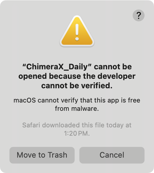 | Summary: | ChimeraX bug report submission → Daily build "developer cannot be verified" |