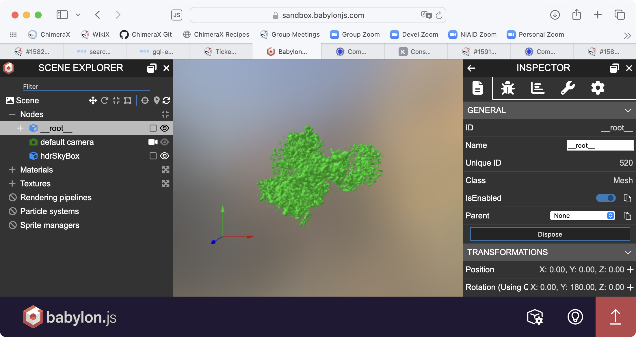 I don't know if this is possible for ChimeraX to accomplish, but this is how I would expect the glTF to be constructed such that the file will rotate/translate/scale around an axis centered on the geometry that is in world space at 0,0,0. You may also be able to do what Babylon does and drop in a parent node at 0,0,0 (this also works in Blender). The reason I don't love this solution is that it has the same issue as Babylon Sandbox. It isn't "fixing" the root problem, the geometry is still not centered on its local origin. It's just buried in a node structure that will need to be maintained for the file to be usuable.