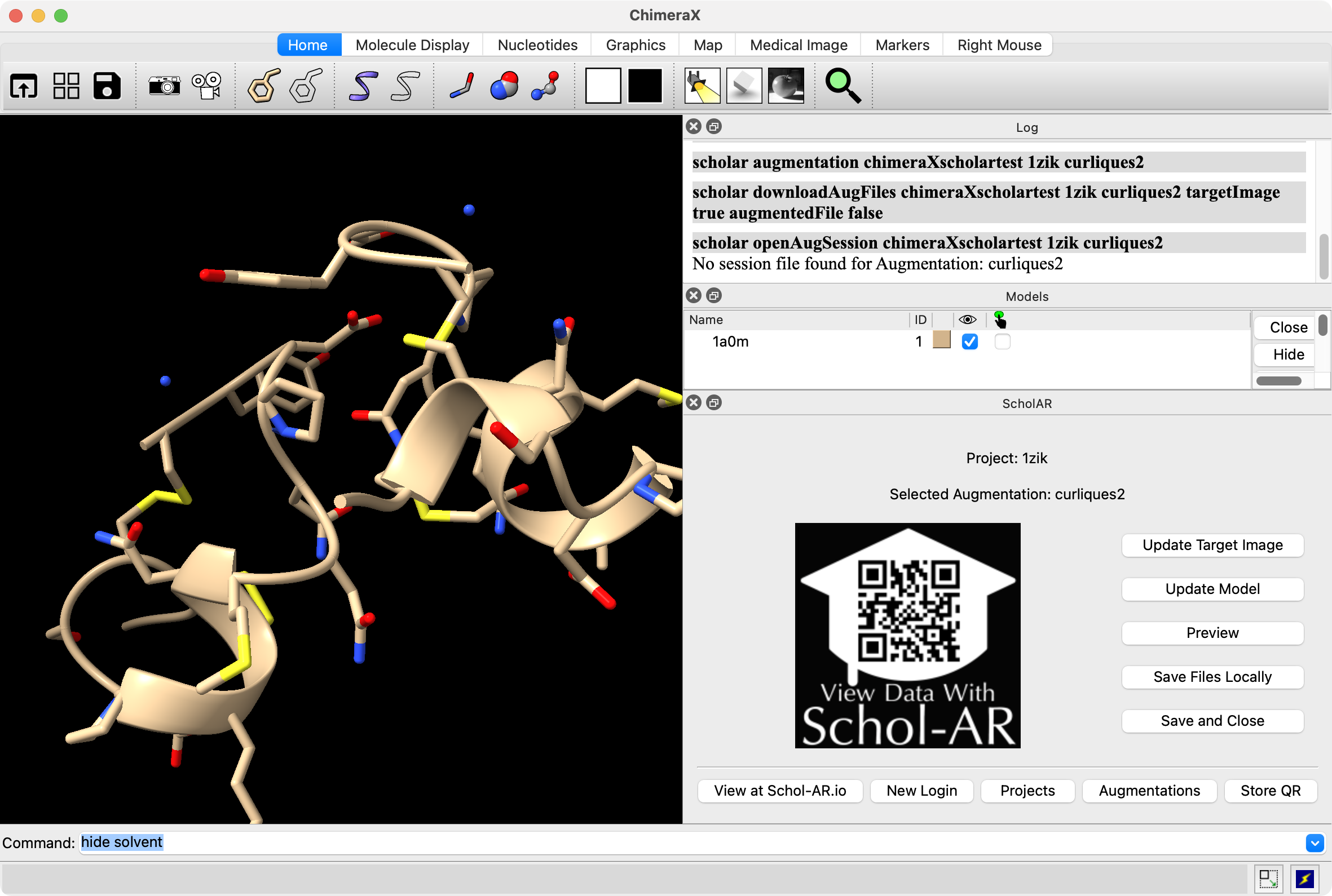 > scholar openAugSession chimeraXscholartest 1zik "rainbow ribbons"