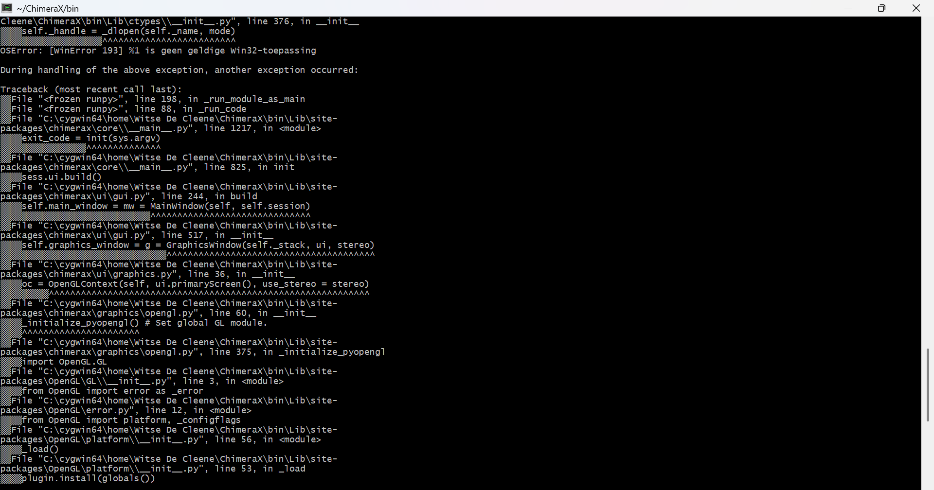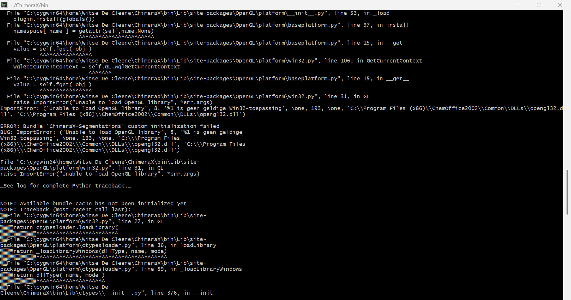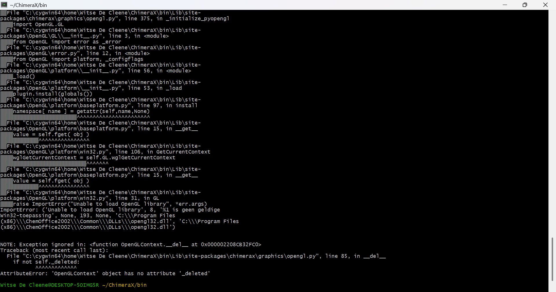 The Cygwin output was helpful. You have an ancient nonfunctional version of the OpenGL library installed on your system that ChimeraX is finding instead of the functional one. Please remove this file and try again: