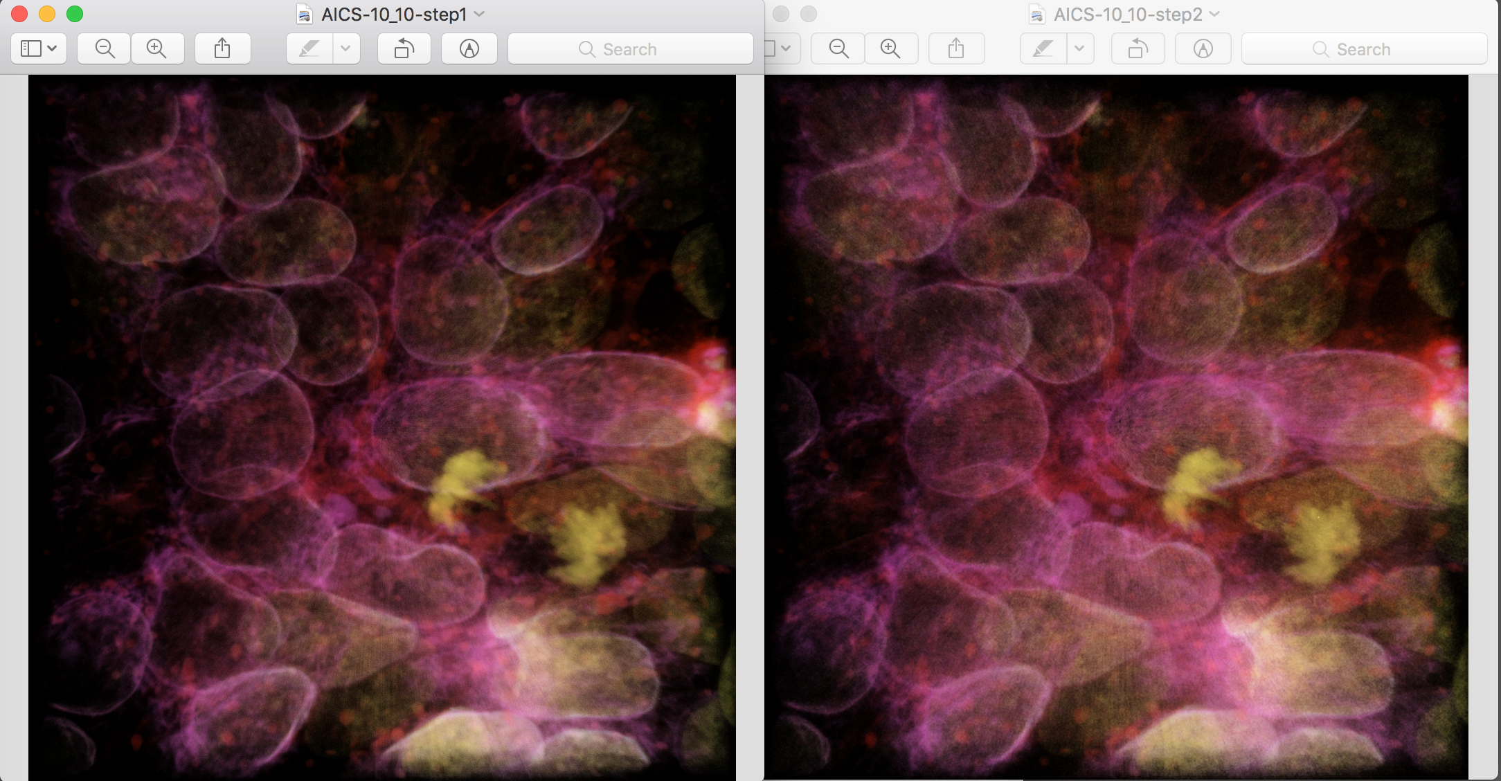 Comparison of step 1 vs step 2 for 3 channel blended light microscopy, 8-bit.