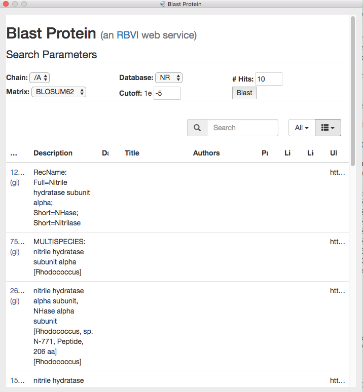 This may or may not be reproducible but on some of my Blast Protein searches, the results table (or perhaps the window containing it) did not have a horizontal scroll bar, so it was impossible to see some of the columns. Could only see 2-3 leftmost columns. Table should be much more compact anyway... numerical columns much too wide, etc.