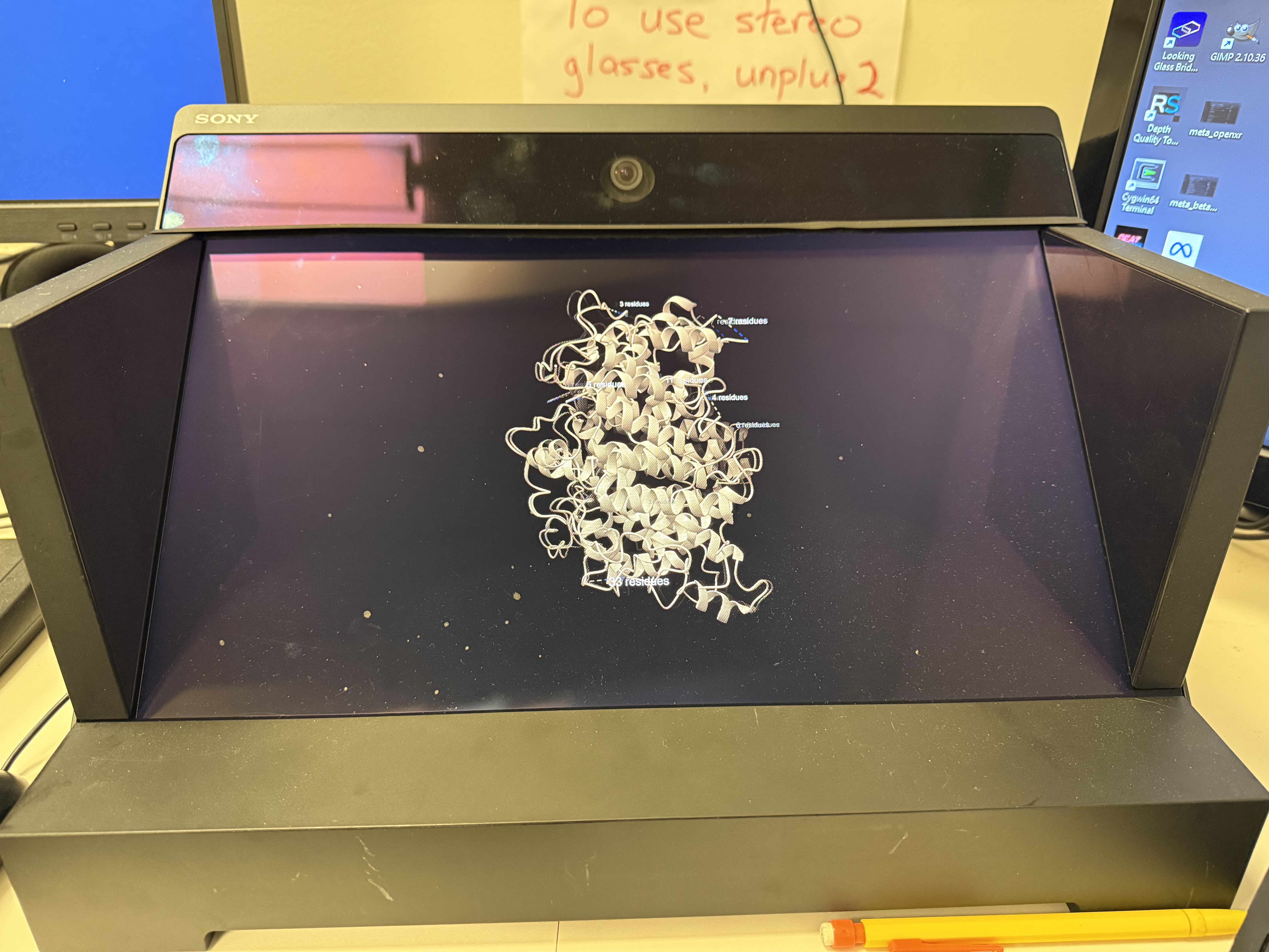 Greg, I am still interested in hearing if your Sony 27" 3D display has the same display name ("SR Display GB") and initial scene zoom issues (9x too small) that Utz observes. Maybe the next time you are at SLAC you can take a look. I'd like to fix these issues in the ChimeraX daily build so the Sony 27" works well. While I could go on what Utz observed it is sufficiently weird (the coordinate system not being based on meters like all other OpenXR) that I am worried it is Sony driver-version specific problem and fixing it to work for Utz won't fix it to work for other Sony 27" 3D displays. If the behavior is consistent between BioHub displays and SLAC displays I'd be more confident that my changes would be useful for everyone with this display.