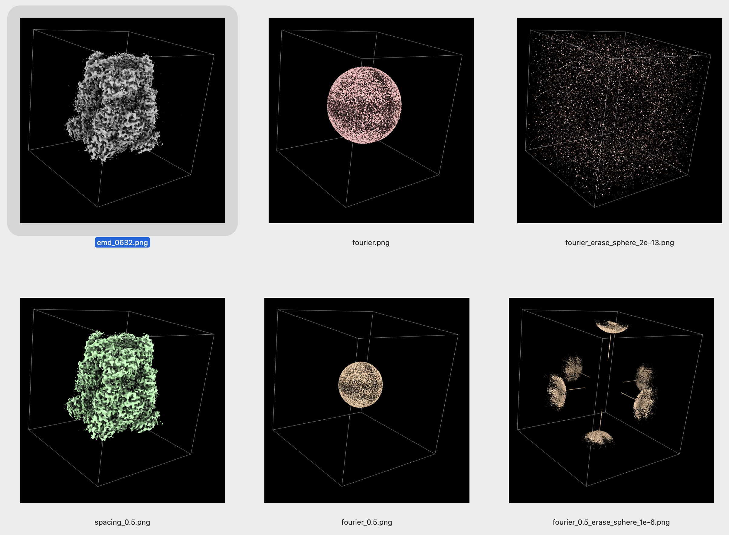 The following bug report has been submitted: Platform: Darwin-19.4.0-x86_64-i386-64bit ChimeraX Version: 0.93 (2020-04-03) Description Hi, Not sure if this is a bug but it is unexpected behavior: The bfactor sharpening command (volume gaussian #map bfactor) when applied to any map that has been resampled on a finer grid than the original (e.g. volume resample #2 spacing 0.5), generates a cloud of fine points (see screenshot), whereas the same bfactor applied in the same way to the original map behaves as expected (generating a slightly sharper map). Cheers Oli Log: > camera ortho > cofr centerOfView > alias focus view cofr false > alias crosshair_on cofr centerofview showpivot true > alias crosshair_off cofr centerofview showpivot false > alias symclip clip near -$1 far $1 position cofr > alias cootmode_wire ~rib; disp; color gold; color byhet; size #* stickradius > 0.08; volume #* capfaces false style mesh meshlighting false squaremesh > false color #307fff step 1; surface cap false; lighting flat depthcue true > depthcuestart 0.2 depthcueend 1.0; graphics silhouettes false; set bgcolor > black; symclip 15 > alias cootmode_surf ~rib; disp; color gold; color byhet; size #* stickradius > 0.08; volume #* capfaces false style surface color #307fff3c step 1; surface > cap false; lighting flat depthcue true depthcuestart 0.2 depthcueend 1.0; > graphics silhouettes false; set bgcolor black; symclip 15 > alias cootmode_surf_white ~rib; disp; color orange red; color byhet; size #* > stickradius 0.08; volume #* capfaces false style surface color #002fff3d > step 1; surface cap false; lighting flat depthcue true depthcuestart 0.2 > depthcueend 1.0; graphics silhouettes false; set bgcolor white; symclip 15 UCSF ChimeraX version: 0.93 (2020-04-03) © 2016-2020 Regents of the University of California. All rights reserved. How to cite UCSF ChimeraX > open "/Users/olibclarke1/Dropbox/chimera > models/oli_initial.updated_modified_real_space_refined.pdb" format PDB Chain information for oli_initial.updated_modified_real_space_refined.pdb #1 --- Chain | Description B | No description available D | No description available > open "/Users/olibclarke1/Dropbox/chimera > models/resolve_cryoem_2_b_blur_100.mrc" format mrc Opened resolve_cryoem_2_b_blur_100.mrc, grid size 320,320,320, pixel 0.83, shown at level 0.0236, step 2, values float32 > cootmode_wire Changed 6192 bond radii > volume #2 level 0.1842 > symclip 3 > close all > open "/Users/olibclarke1/Library/Application Support/ChimeraX/0.93/site- > packages/chimerax/isolde/demo_data/6out/6out.pdb" 6out.pdb title: Asymmetric focused reconstruction of human norovirus gi.1 norwalk strain VLP asymmetric unit In T=3 symmetry [more info...] Chain information for 6out.pdb #1 --- Chain | Description A B C | capsid protein VP1 > open 20205 fromDatabase emdb Opened emd_20205.map, grid size 98,112,104, pixel 1.07,1.07,1.07, shown at level 0.287, step 1, values float32 > volume #2 level 0.174 > cootmode_wire Changed 11622 bond radii > symclip 3 > volume #2 level 0.1113 > volume resample #2 spacing 0.5 > cootmode_wire Changed 11622 bond radii > symclip 3 > symclip 5 > symclip 3 > lighting depthCueEnd 0.5 > lighting depthCueEnd 1 > lighting depthCueStart 0 > symclip 3 > volume #3 level 0.1306 Drag select of > ui mousemode rightMode clip > volume #3 level 0.1043 > volume #2 level 0.07989 > volume gaussian #2 bfactor -50 > volume #4 level 0.4006 > volume gaussian #3 bfactor -50 > focus OpenGL version: 4.1 ATI-3.8.24 OpenGL renderer: AMD Radeon Pro 5500M OpenGL Engine OpenGL vendor: ATI Technologies Inc. File attachment: Screenshot 2020-05-20 20.56.53.png