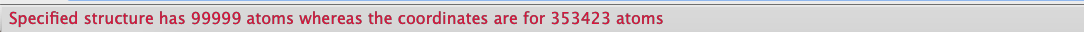 I just tried it (Mac build) and am running into an atom mismatch between structure and trajectory (see screenshot). I didn't try with a smaller trajectory (sorry, can do that later if necessary) but since I see 99999, I'm guessing I'm hitting some sort of hard limit with indexing or bookkeeping. What do you think? [image: image.png] On Wed, Sep 23, 2020 at 8:28 AM ChimeraX <ChimeraX-bugs-admin@cgl.ucsf.edu> wrote: