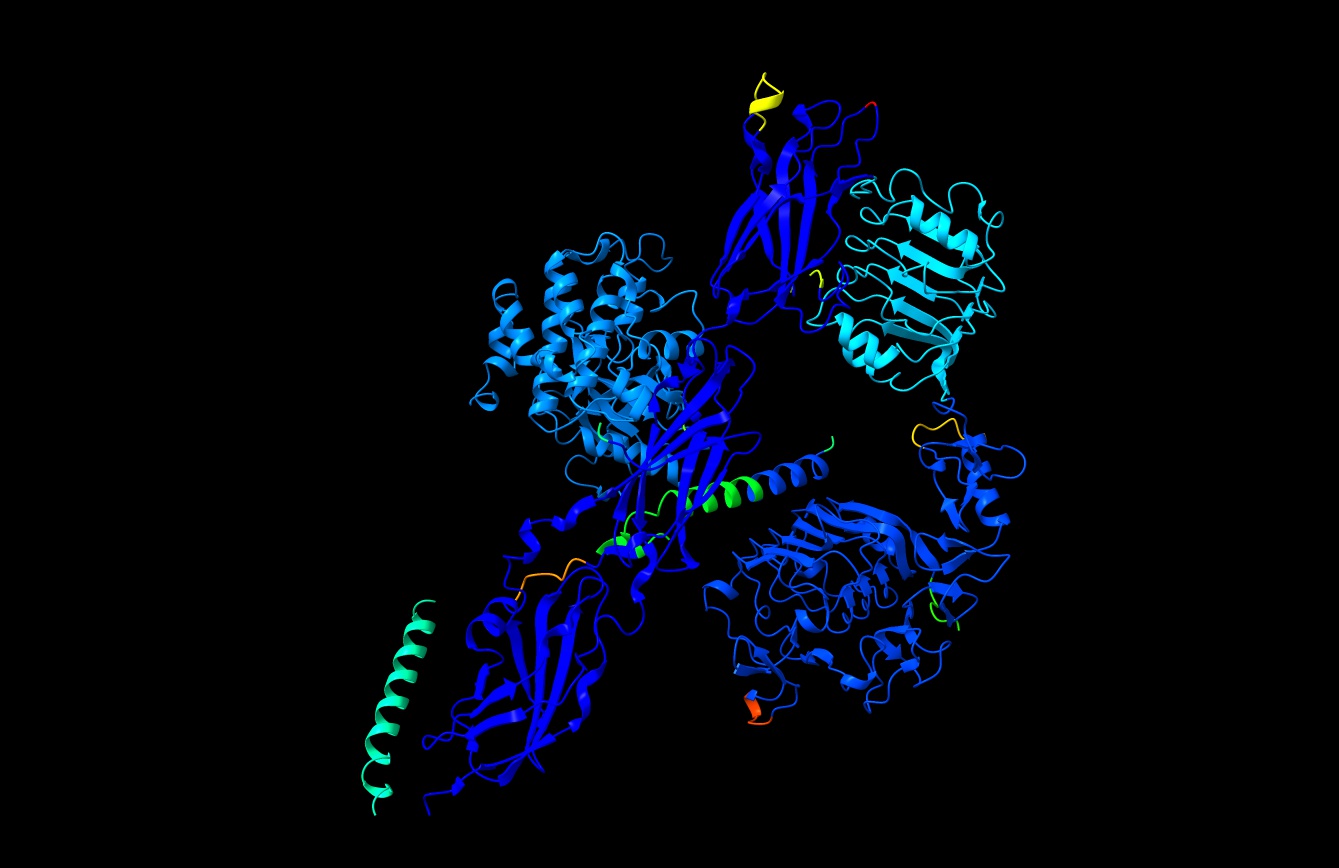 Domain coloring for AlphaFold database entry Q5VSL9 showing one core domain, and 3 disordered regions.