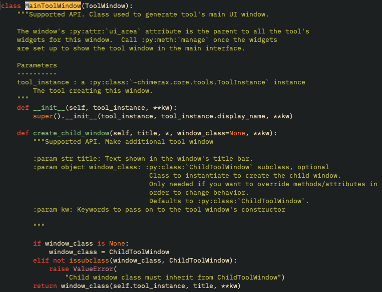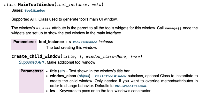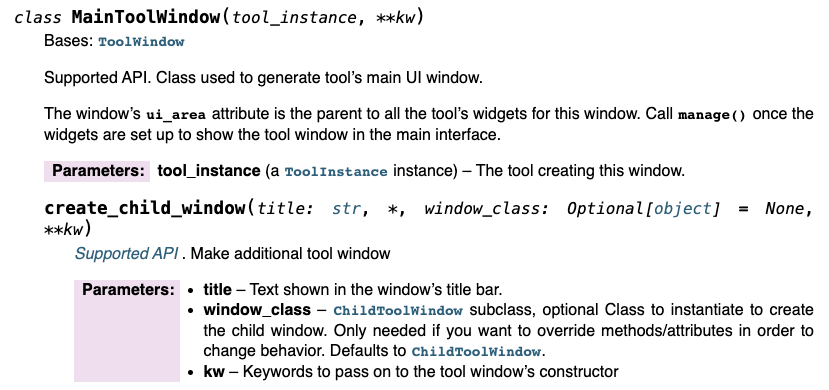 Docstrings after enabling just the Napoleon extension; the constructor's documentation is fixed but create_child_window still looks bad