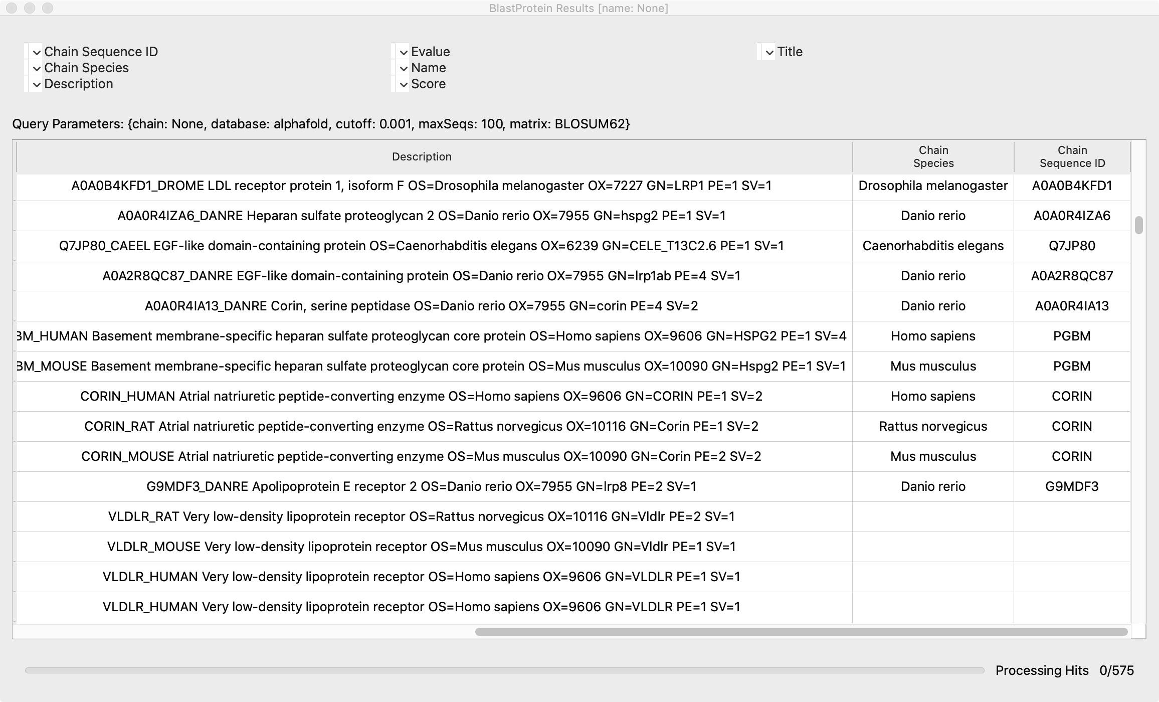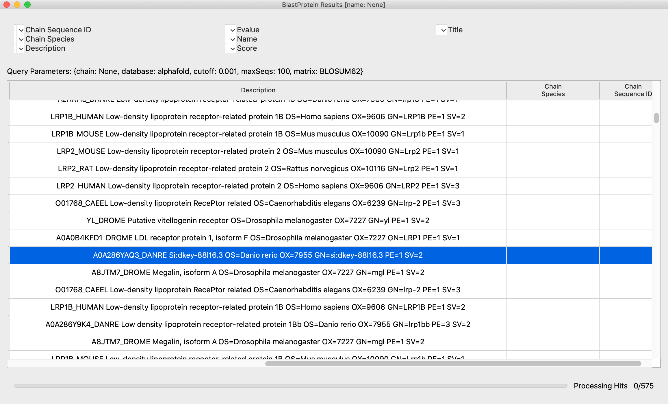 Currently the Blast output dialog has inconsistent values in the Chain Sequence ID field. Sometimes it is gene name, sometimes it is the part of the Name (UniProt Name) preceding the underscore, sometimes blank. Maybe we should get rid of Chain Sequence ID and add a Gene Name column with the GN value from the Description. It usually looks reasonable but is occasionally weird, e.g. for hit highlighted in the second screen shot.