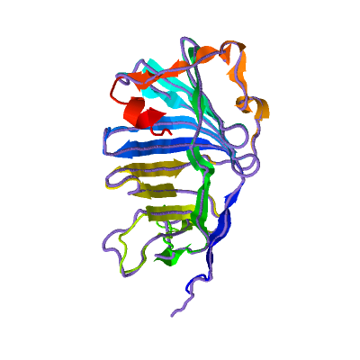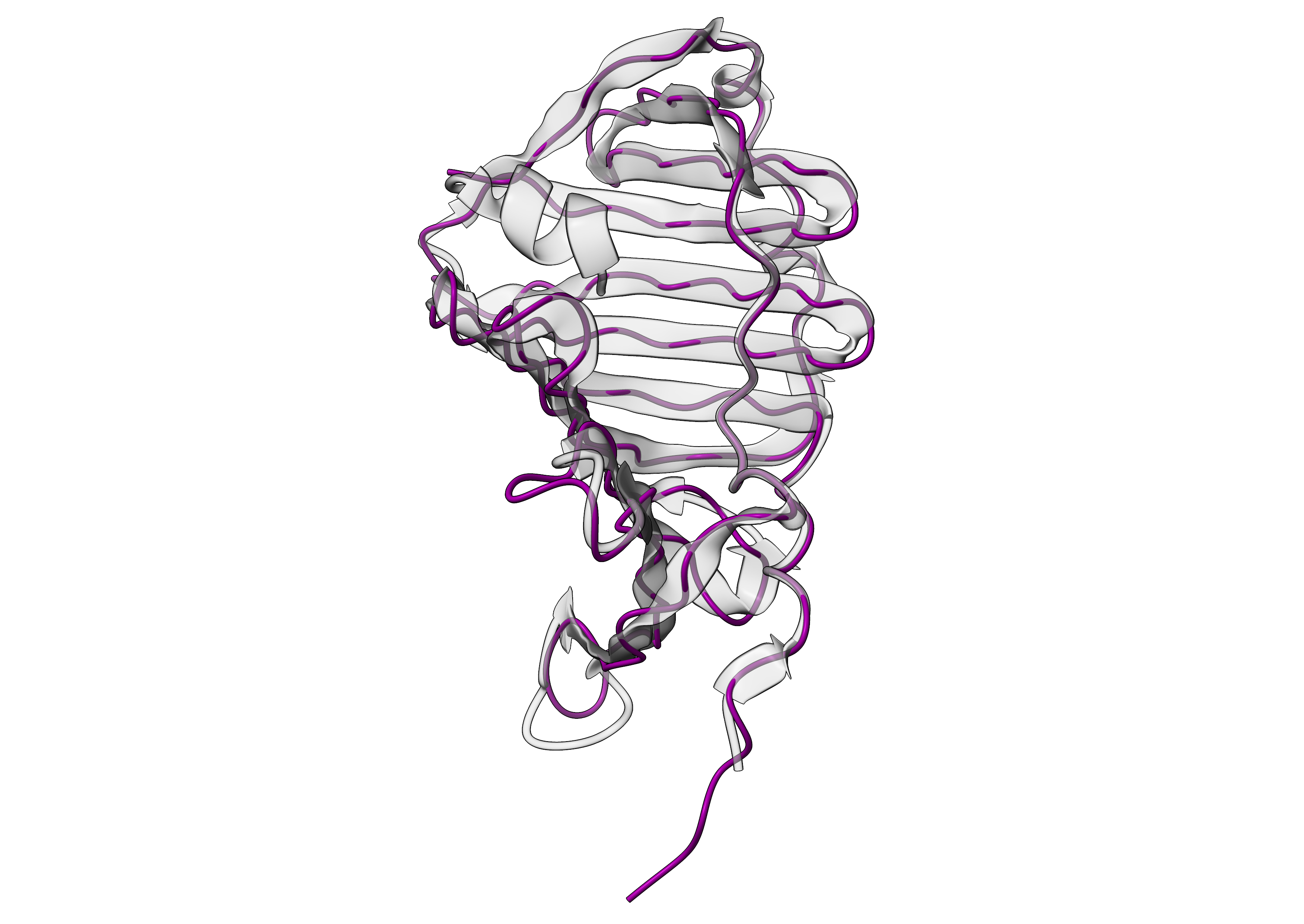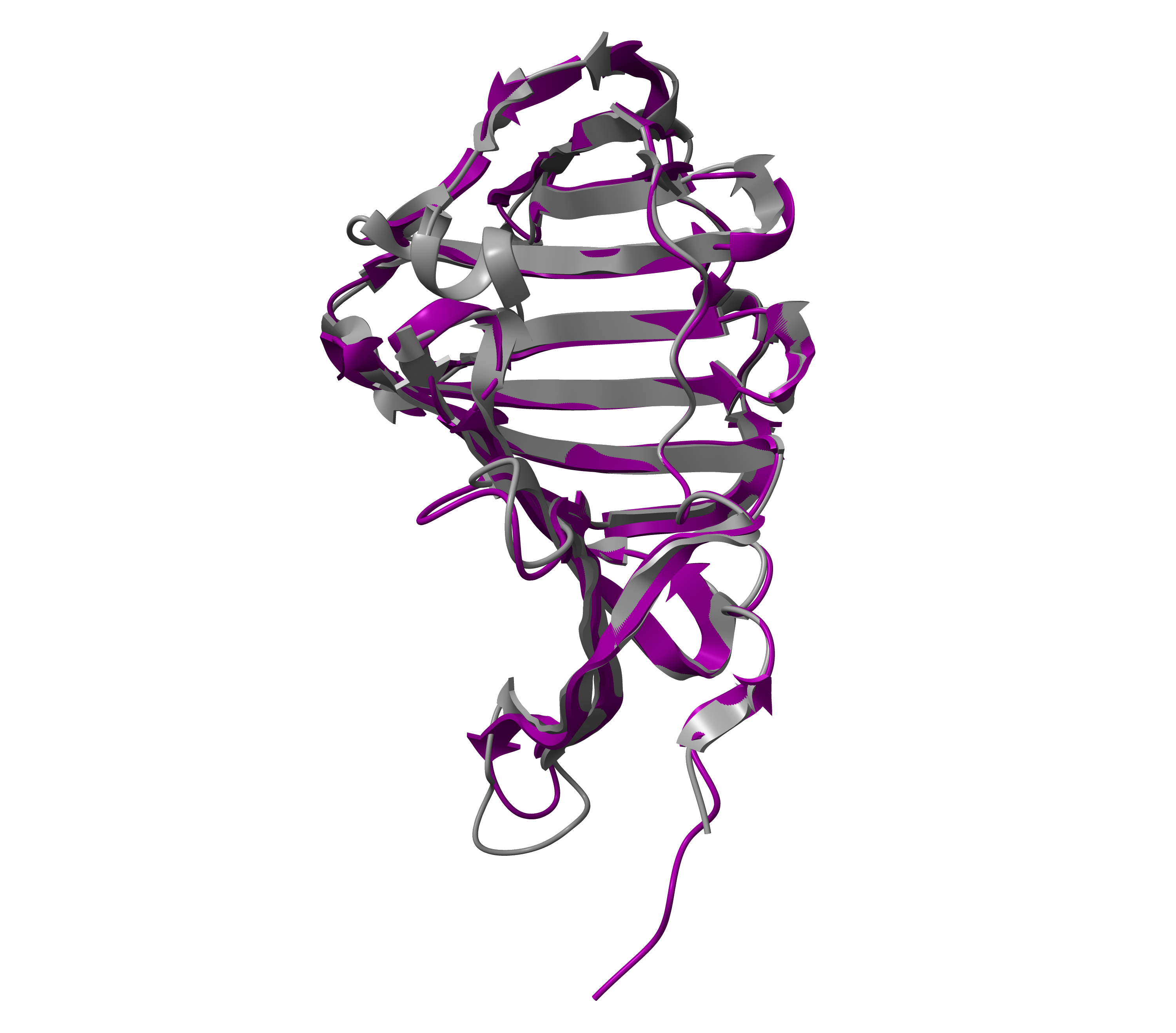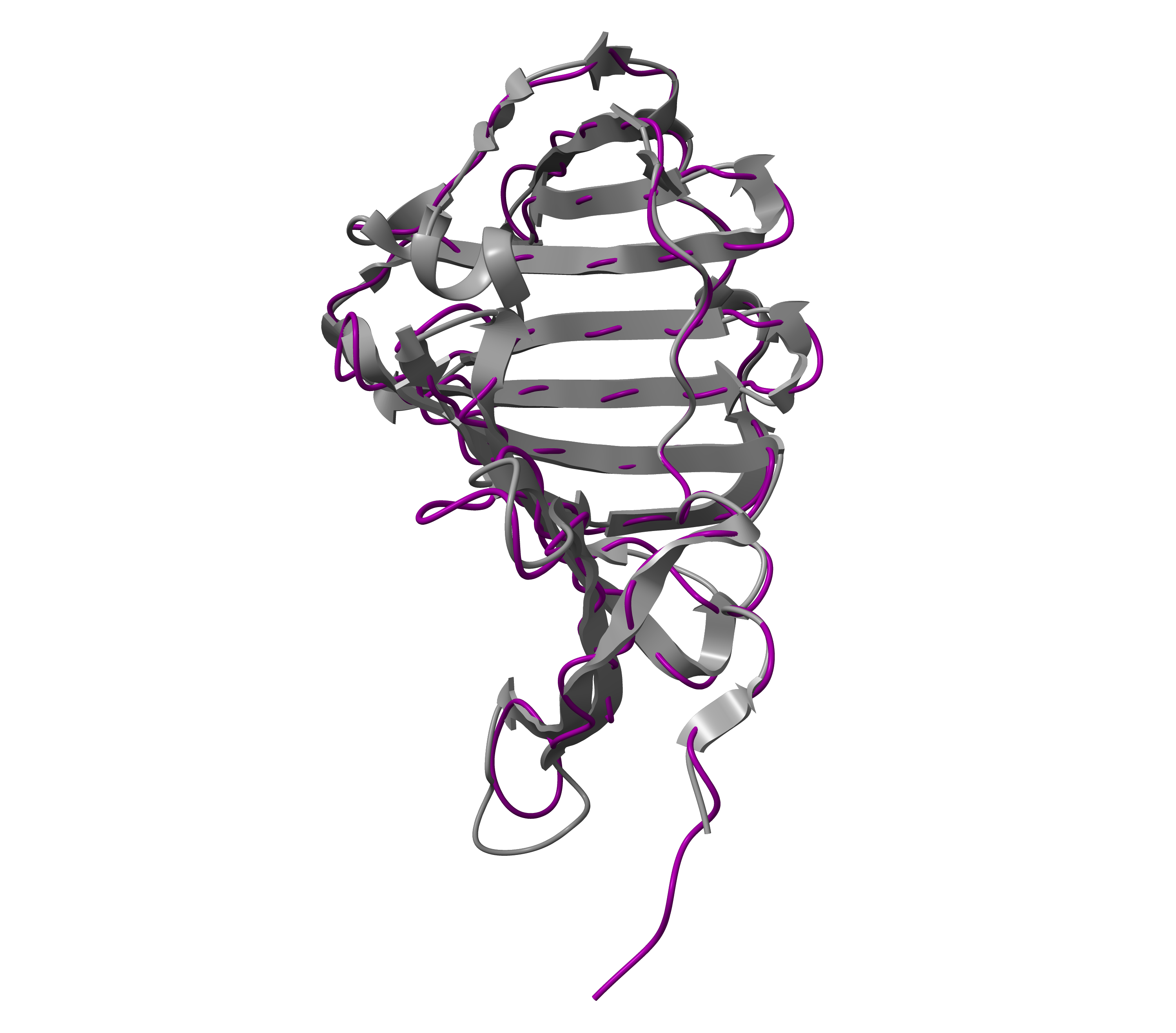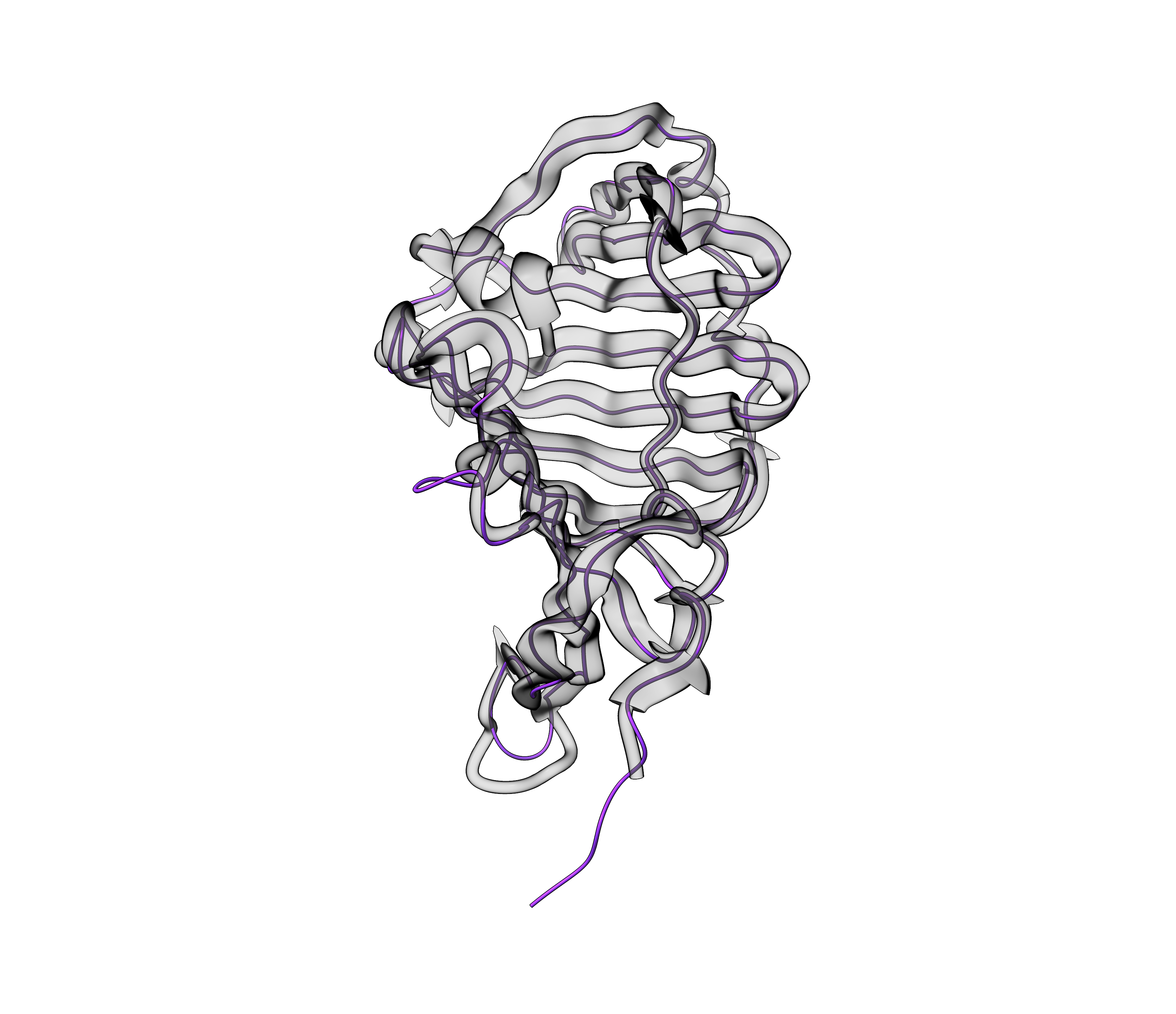 However, the purple chain still looks sewed into the gray chain. In the image, this is better seen in the horizontal beta sheets at the center. The ideal display I was after is that of the image with the rainbow-colored chain and the purple template I sent in my original email. There, the purple chain always looks "on top" of the rainbow chain. That is what I meant yesterday with "the ability to superimpose the view of one chain".