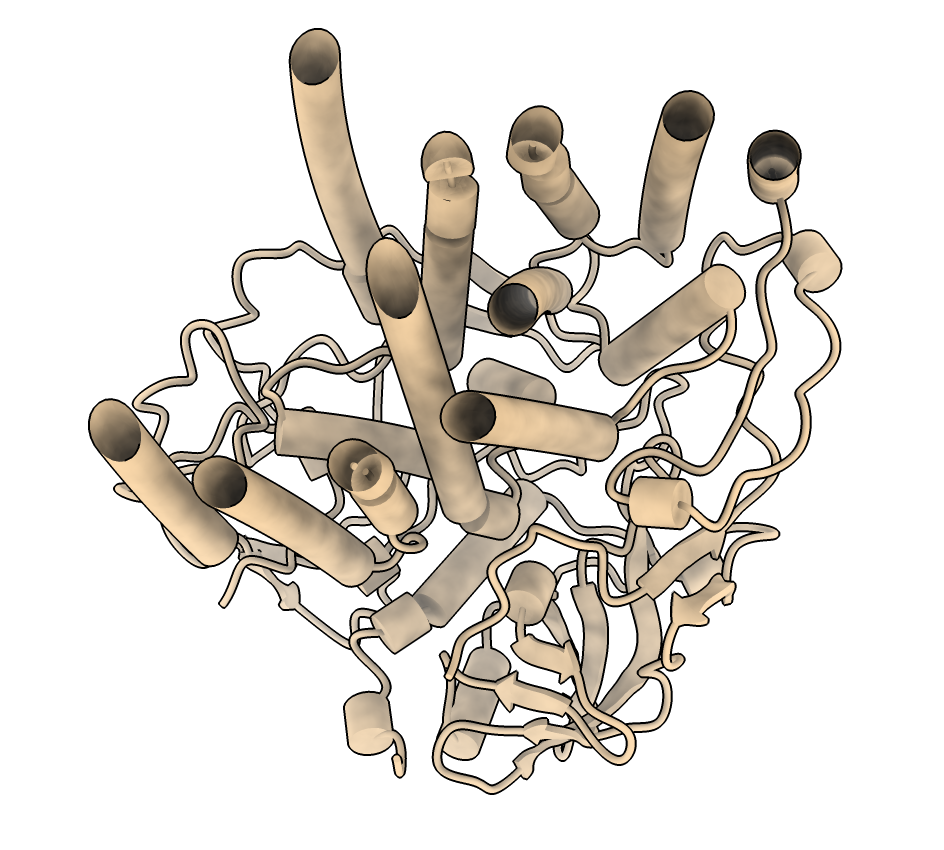 Clipped ribbon with tube helices, no caps due to cylinder seams.