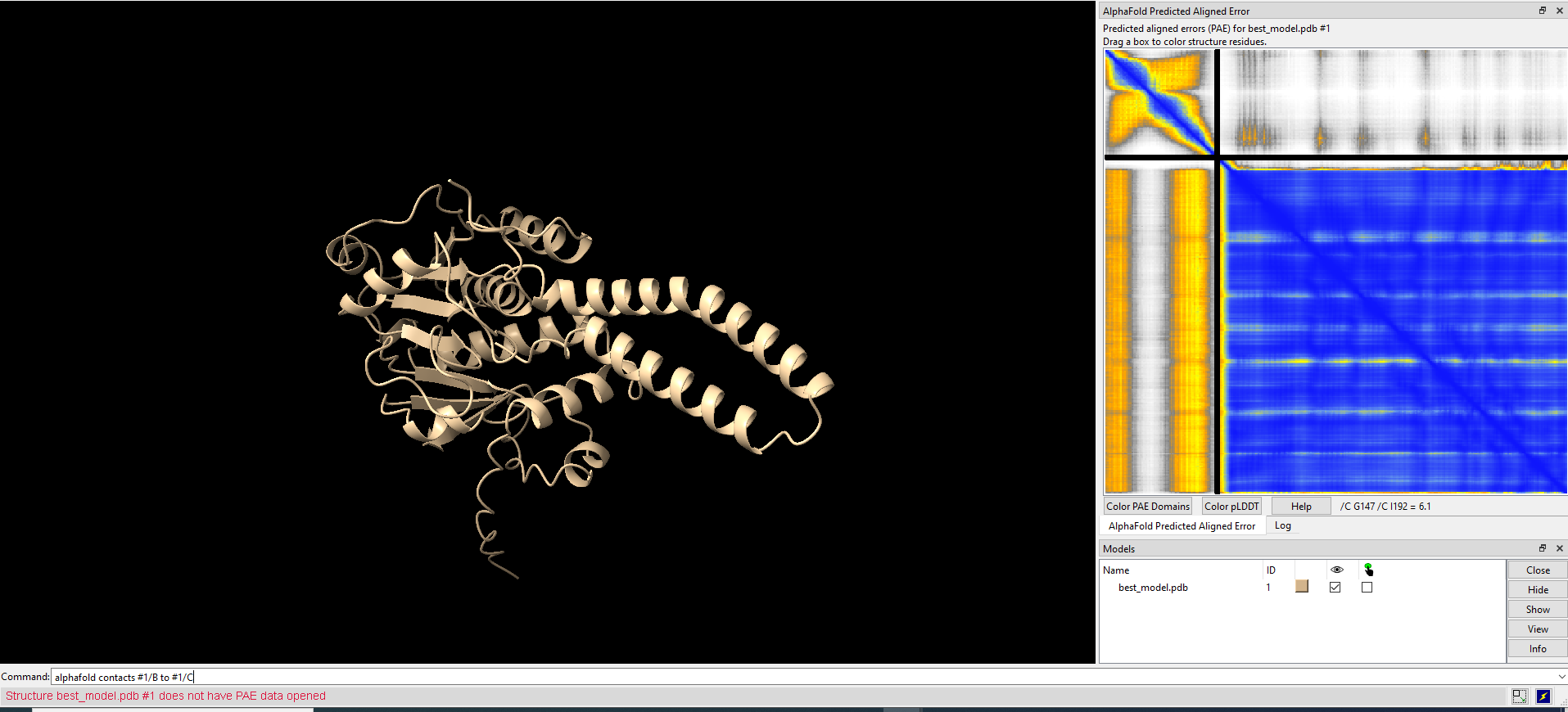 Dear ChimeraX team, I used the alpha fold prediction to align two interacting proteins and wanted to highlight the predicted aligned errors as described by the YouTube video. Even though I opened the alphafold predicted aligned error for the prediction of interest, Chimera X gives me the error message "Structure best model does not have PAE data opened" when invoking the command alphafold contacts /A to /B distance 8. Thanks for helping, Annika