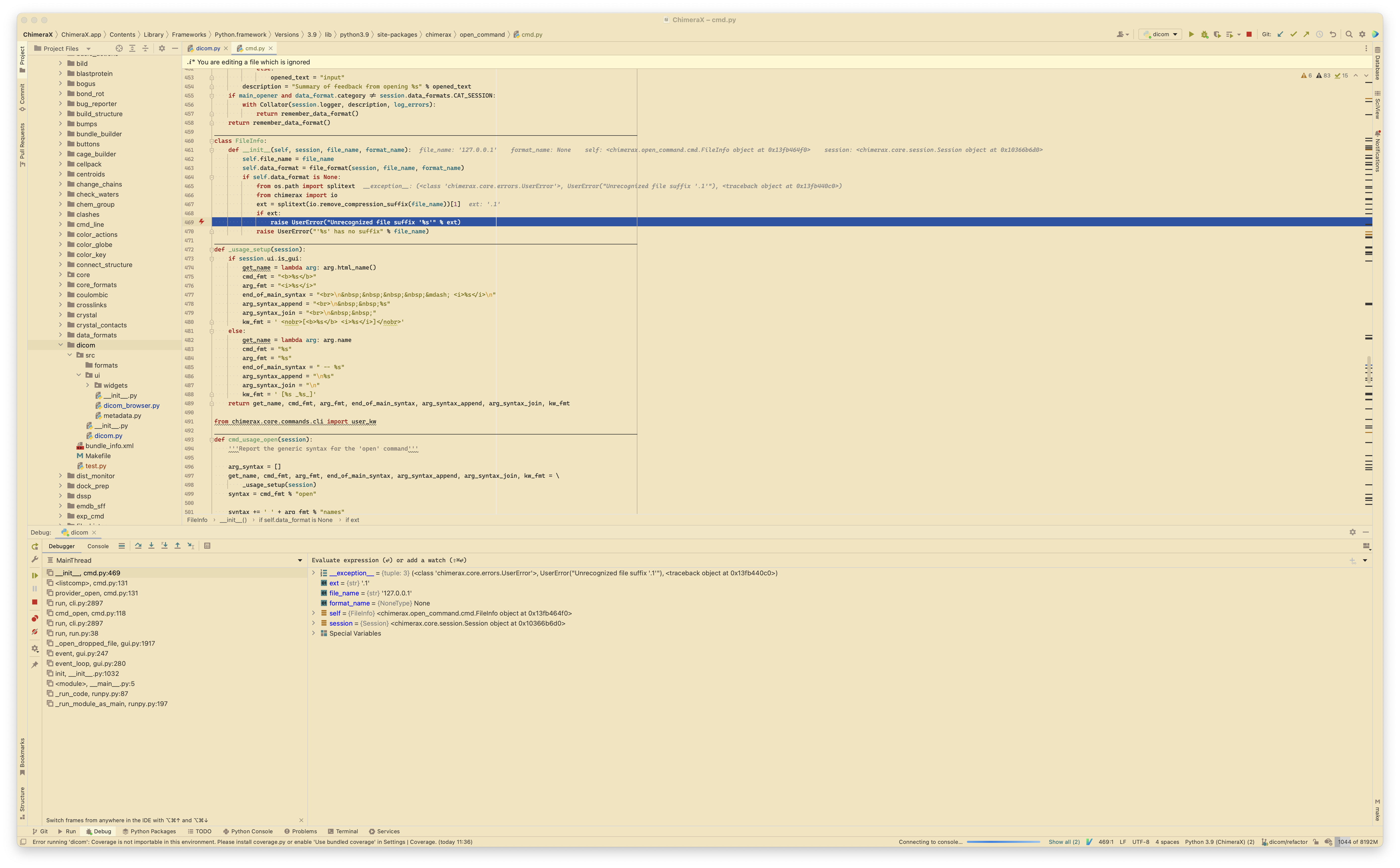 The GUI deals with spurious file drop events in MacOS, and calls a function (open_dropped_file) that needed a try-catch block. The function is found wrapped in a similar try-catch elsewhere; I just added it around the failing code path. ChimeraX can now be launched, paused, stepped through live, and generally debugged in PyCharm.