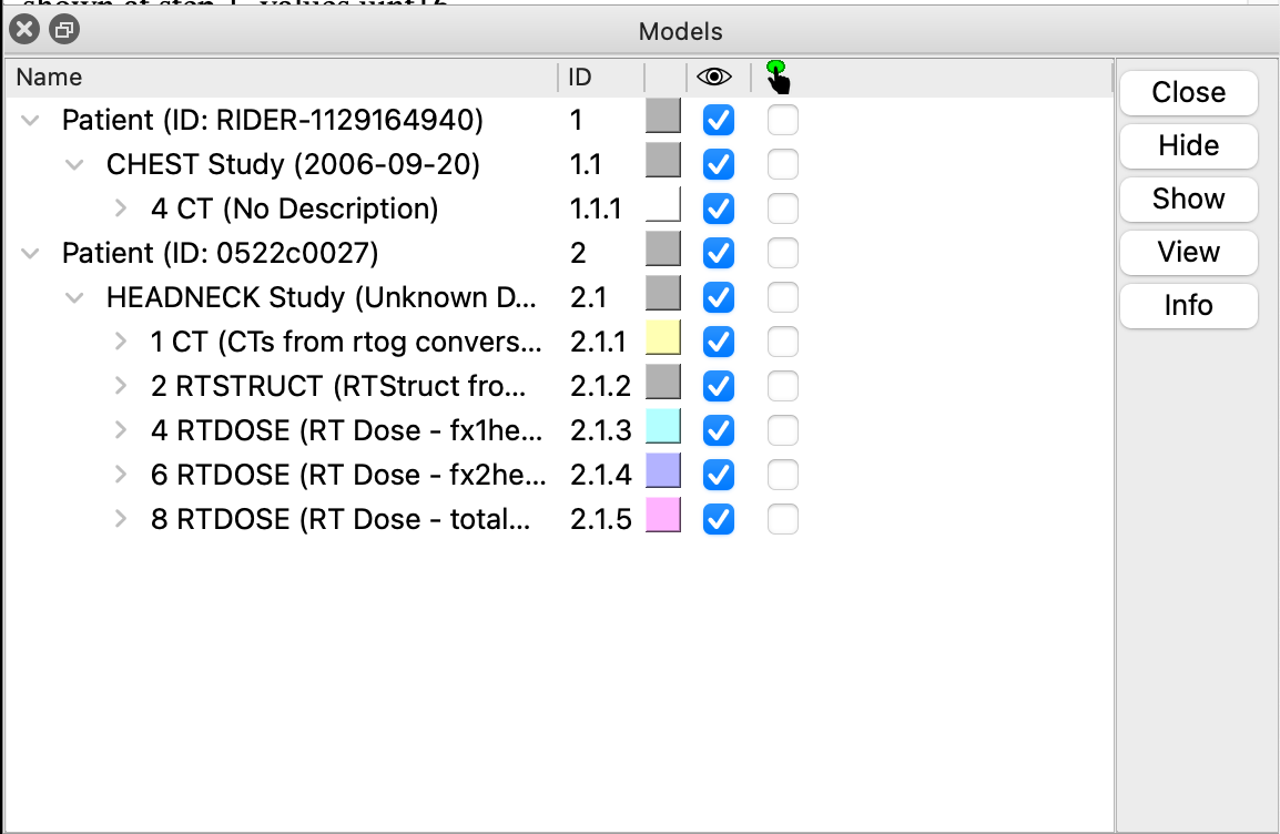 Currently they are all shown as "image" style single plane, and all white (2 CT and 8 SEG models). So there should at least be the same treatment as when you open multiple density maps, that there is some kind of color series so that each is unique.