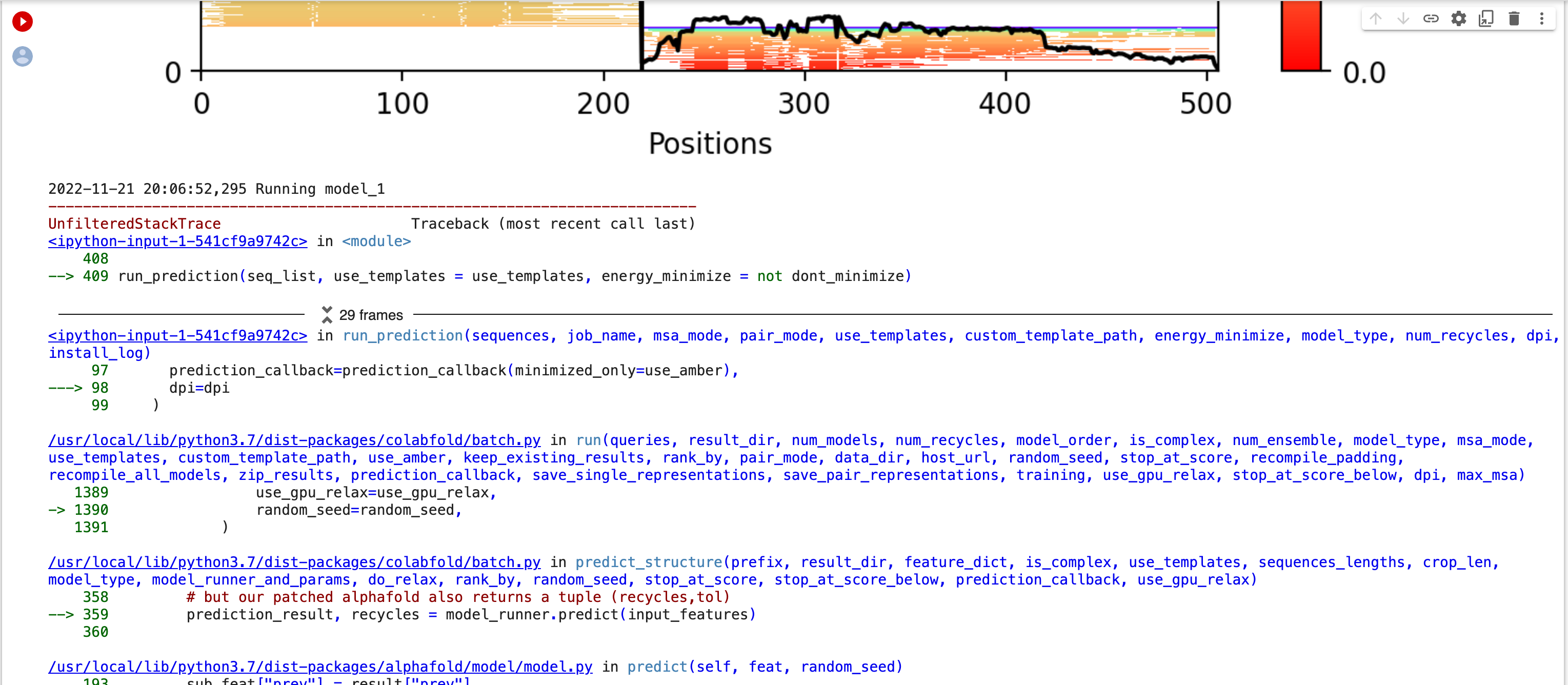I'm using Alphafold to predict complexes between 2 proteins. It has worked many times, but the last few times give an error message (see screenshot attached) 'I/O operation on closed file'. I'd appreciate any advice you can give me.