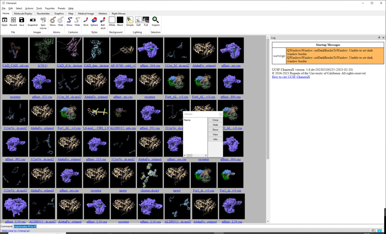 Hi Eric, I had reported the non-functional viewdockx module in ChimeraX (when used with SwissDock output files) about 2 years ago (see bug report #4232). Following the ChimeraX update notifications (see ChimeraX notification email from 2023/02/03 on bug #4232) I had actually assumed that viewdockx had been repaired and was functional. When trying with ChimeraX 1.5 I noticed that it still does not work plus that the daily build I used for testing (2023/02/09) caused an additional bug with permanent alteration of the setup of the "Tools/Models" panel as reported a few days ago (see bug report #8473). For the latter, please take a look at the attached screenshot (photo_2023-02-10_18-39-07_ChimeraX-Startup.jpg). Regarding the former, please see the second screenshot (photo_2023-02-14_16-56-37_viewdockx.jpg). The script I used to try loading the SwissDock docking output files is the following one which I got from Elaine Meng a long time ago when I first asked about how to work with SwissDock in ChimeraX (and not Chimera): open C:\test\CAD4\swissdockd\target.pdb viewdockx C:\test\CAD4\swissdockd\clusters.dock4.pdb color byatom #0 ribbon #0 repr stick :LIG ~disp element.H hbonds intramodel false lineWidth 5 color green Note that all the files I used as well as this script work fine with Chimera 1.16. Also, manual loading of the target protein plus the clusters.dock4.pdb file containing the aggregated ligands works fine in ChimeraX. Cycling through the individual ligands plus displaying the interaction properties as possible in Chimera 1.1.6 however so far remains nonfunctional. Best regards, Michael. Am 14.02.2023 02:52 schrieb ChimeraX: