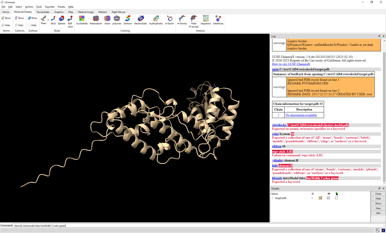 (By the way: I used the daily build, because ChimeraX 1.5 has a bug which is raised upon once using the "repaired" DockView tool with a SwissDock output: the "models" window now remains permanently / by default unchecked in the tools menu and the "models" tab permanently appears as separate window upon ChimeraX startup - which requires manuel window closing (or double-clicking in the side panel to place it there; it's really "annoying".)