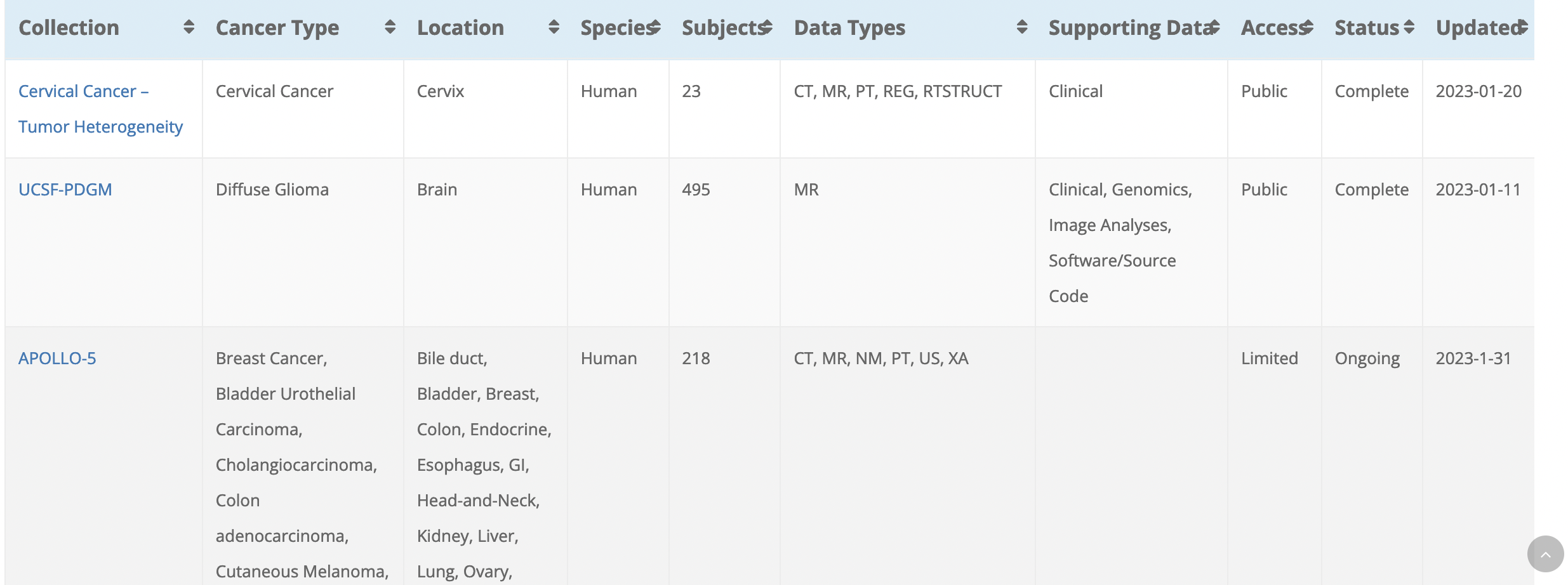 Hi Zach, If it's not too many things, I would vote for Collection (sans "Name") Cancer Type (sometimes redundant with Location but often has more info) Species (I saw a lot of dogs and rodents when I was browsing around) Subjects (since dogs and rodents aren't really patients? But I'm OK with "Patients" too if you preferred it since that is DICOM terminology) Modality (or "Data Type" or "Data Types" ... whichever you like, really, and Modality is reasonable since it's DICOM terminology) The image is a screenshot of the Browse Collections page at the TCIA website: