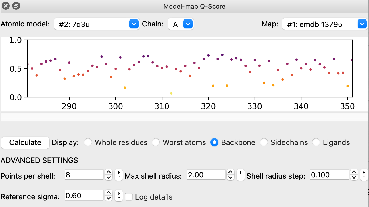 I thought about hiding the advanced settings as well, but then decided it would be best to keep them visible (with a clear visual indication for any non-default values). My reasoning was that the Q-Score is now part of the official wwPDB validation report for cryo-EM models... while it's good to give users the freedom to experiment with different settings for their own purposes, it's also important to make sure they can't forget when they've deviated from the official parameters.