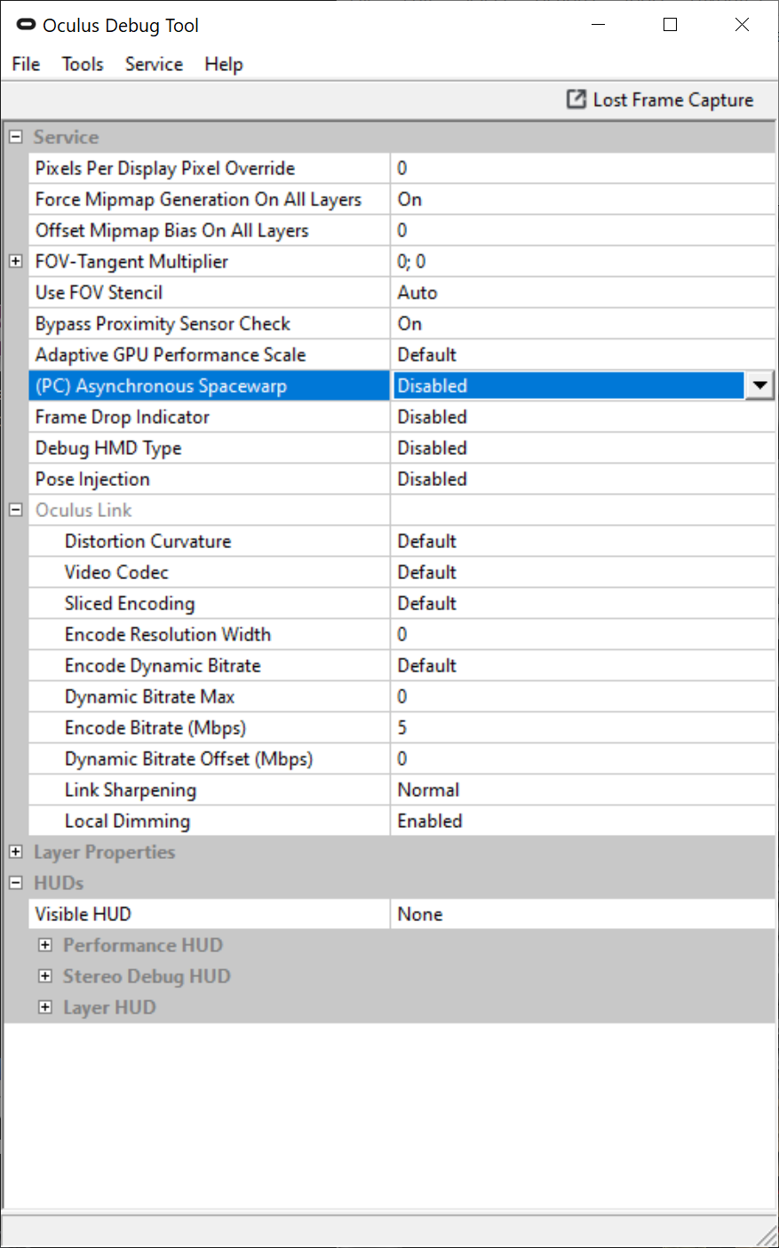 2) If you want to use Quest Link or Air Link, then use Oculus Debug Tool to disable PC Asynchronous Spacewarp. I'm not sure if Oculus Debug Tool can change defaults, it may only change for the current VR session, so very painful. But this post suggests that Oculus Tray Tool can change the default. I have not tried it. I attached an image of the Oculus Debug Tool version 60.0.0.162.352 so you can see what the option looks like.